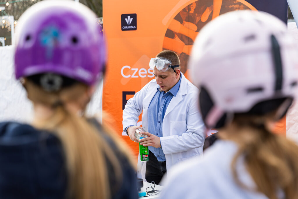 Nasz Ambasador, Michał Kud, to człowiek, który potrafi „odczarować” naukę. Jego pokazy to nie tylko widowiskowe wybuchy i kłęby dymu. To lekcja krytycznego myślenia. Kiedy dzieci widzą na własne oczy, jak ekstremalny chłód oddziałuje na materię i jak uwalnia się energia, przestają traktować ekologię jako abstrakcyjne hasło. Zaczynają rozumieć procesy, które rządzą naszą planetą. To właśnie te „iskry w oku” młodych obserwatorów są dla nas dowodem, że nauki ścisłe podane w przystępny sposób są najlepszym narzędziem w walce z dezinformacją.